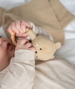 Macis fa babacsörgő: Az aranyos textil csörgő fából készült fogantyúval stimulálja a baba érzékeit,