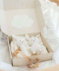 Babaajándék takaróval, A legexkluzívabb babaajándékunk egy pazar díszdobozban érkezik, és három gondosan válogatott nyuszis terméket tartalmaz,