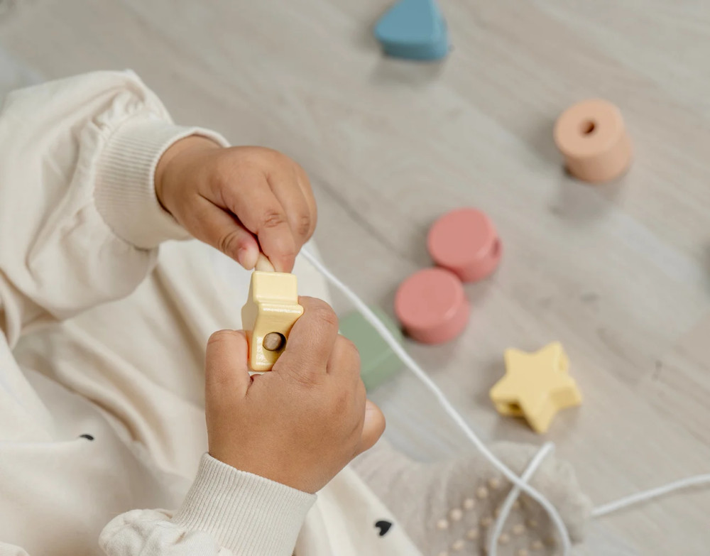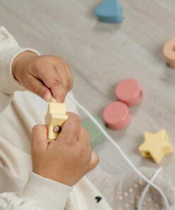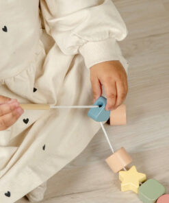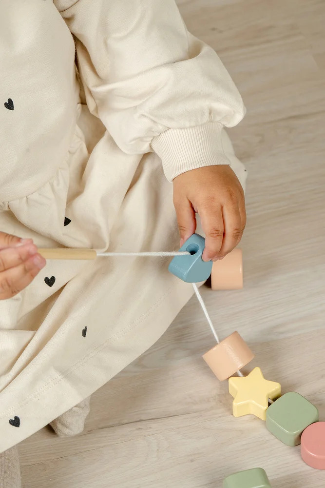 Fűzőgyöngyök, A fa gyöngyök zsinórral kiváló játék a gyermekek finommotoros készségeinek, kézügyességének és szem-kéz koordinációjának fejlesztésére,