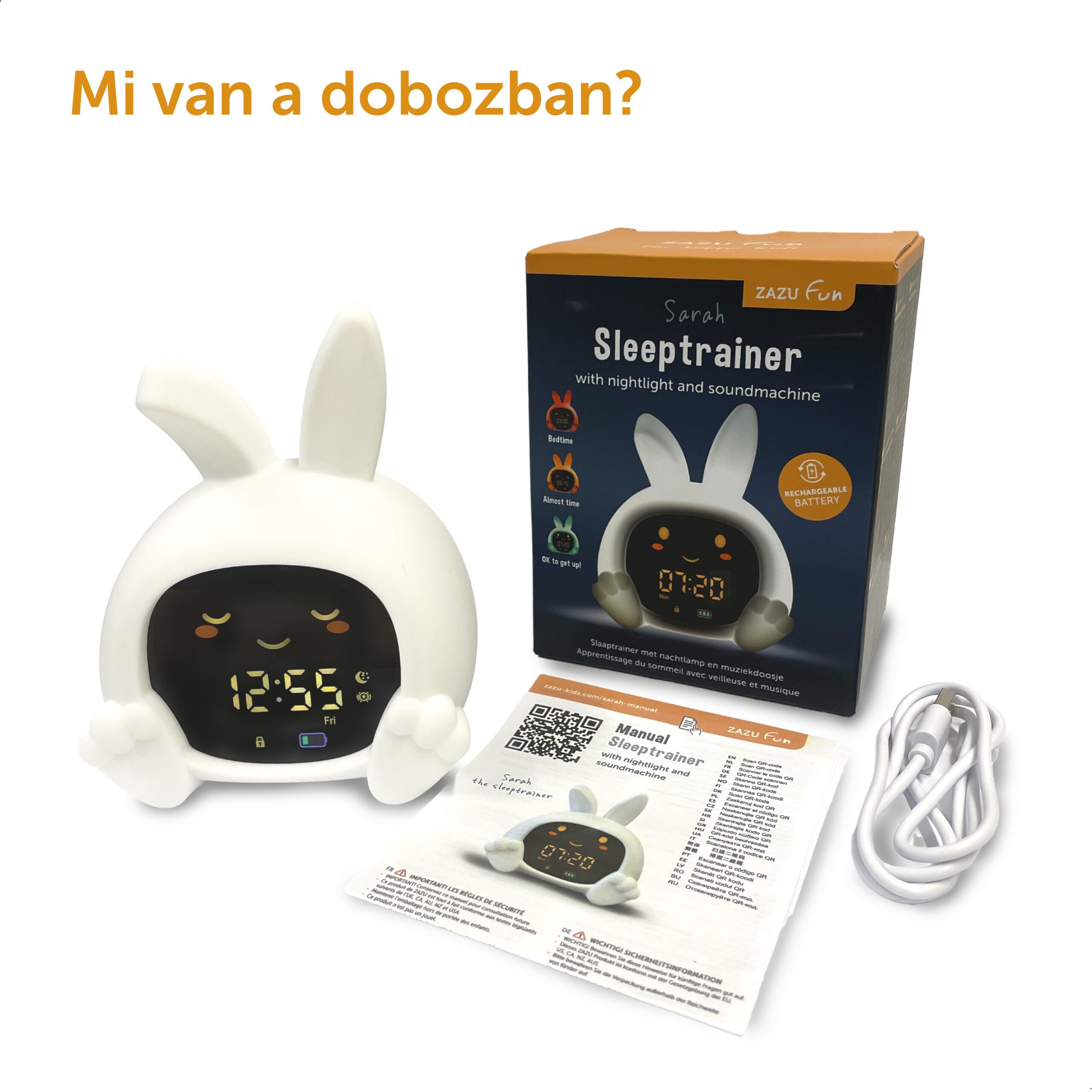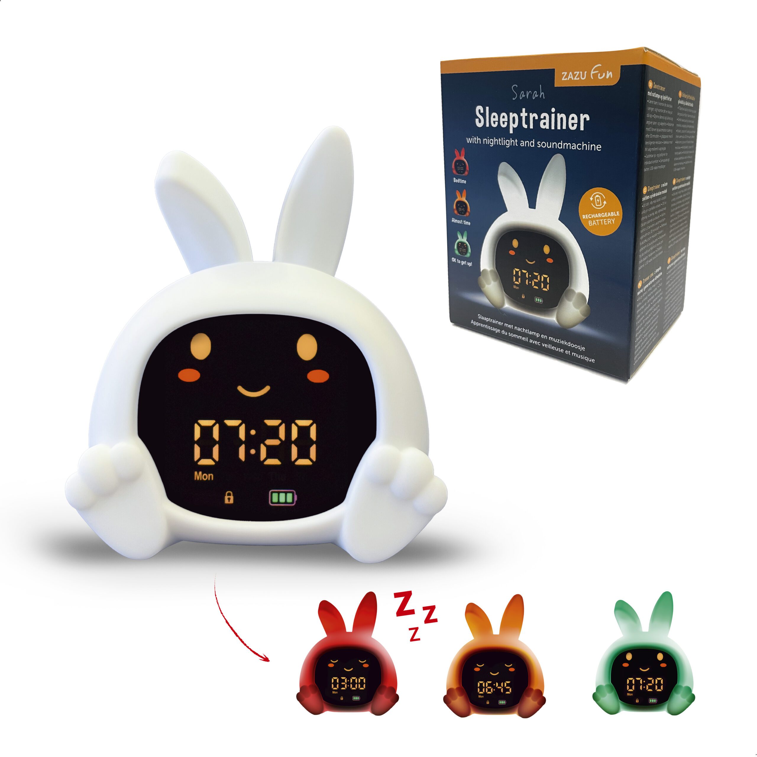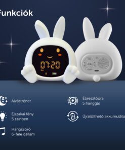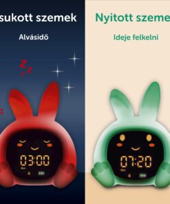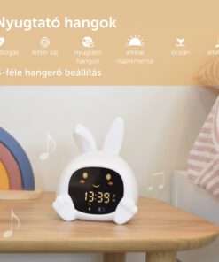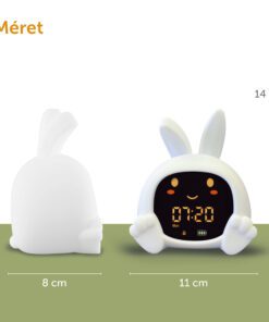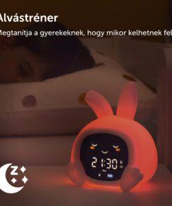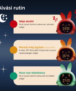 Sarah nyuszi alvástréner segít a gyerekeknek megérteni, mikor van itt az alvás ideje, és mikor szabad felkelni. Színes fényjelzésekkel, mozgó szemekkel, éjszakai fénnyel és megnyugtató hangokkal támogatja a nyugodt lefekvési rutint.