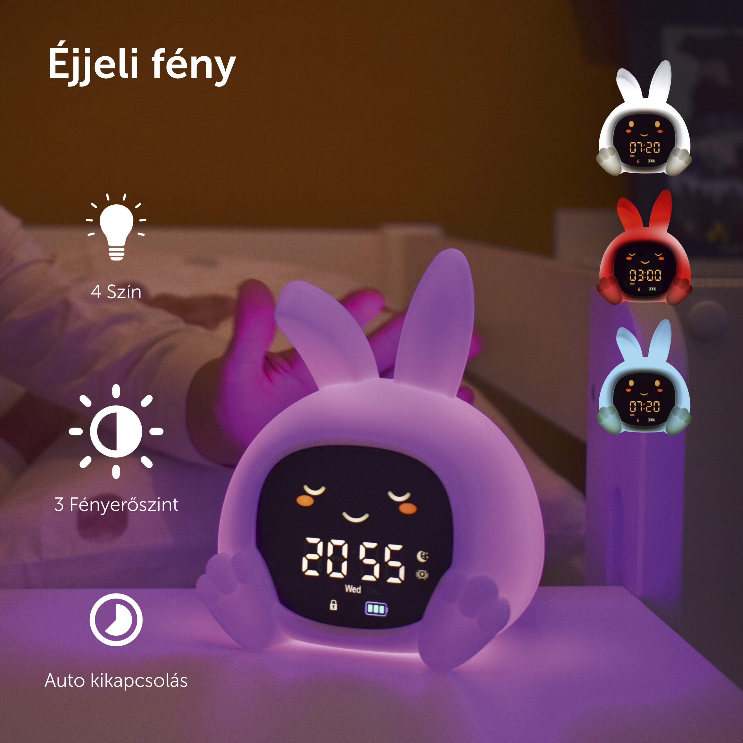- Éjszakai fény: 5 választható szín, automatikus 30 perces kikapcsolással