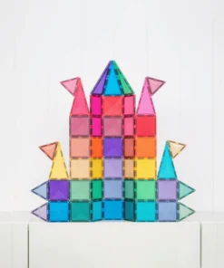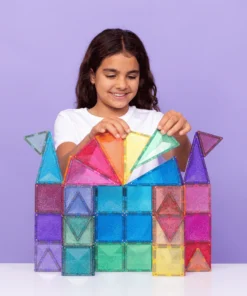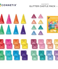 A CONNETIX mágneses építőjáték csillámos kastélykészletéből nemcsak tündöklő kastély, hanem csillogó torony, híd, mesebeli állat vagy fénytörő rakéta is épülhet.