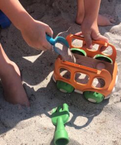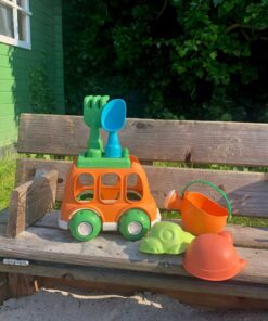 Szerves, lebomló anyagokból készült öko homokozó szett, amely 6 részből áll, közte egy levehető tetejű gurulós autóval, melyre ráilleszthetőek a homokozó lapátok.