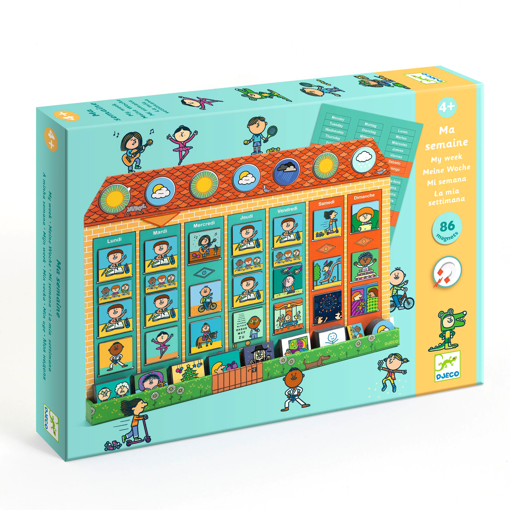 <p style="text-align: justify;"><span style="color: #000000;">A Djeco heti tervező mágnestáblája megkönnyíti az időbeli tájékozódást. Szórakoztató megközelítést kínál a múlt, jelen és jövő fogalmainak elsajátítására, segít a jelenben élő gyermeknek abban, hogy emlékezzen a múltbeli tevékenységekre, és előre lássa a jövőbeli teendőket. </span>A ház alakú mágnestáblán először elnevezheti a hét napjait, majd választhat a különböző hétköznapi jeleneteket – sport- vagy művészeti tevékenységeket, rendszeres vagy kivételes eseményeket (pl: születésnap stb.) – ábrázoló, valamint az időjárást jellemző mágnesek közül, így kínálva végtelen lehetőséget a heti teendők megtervezésére. Az üres mágnesek lehetővé teszik a gyermek számára, hogy saját illusztrációk rajzolásával személyre szabja heti tervezőjét. </p>