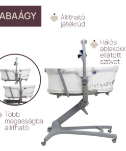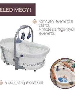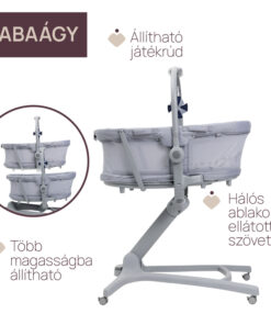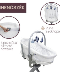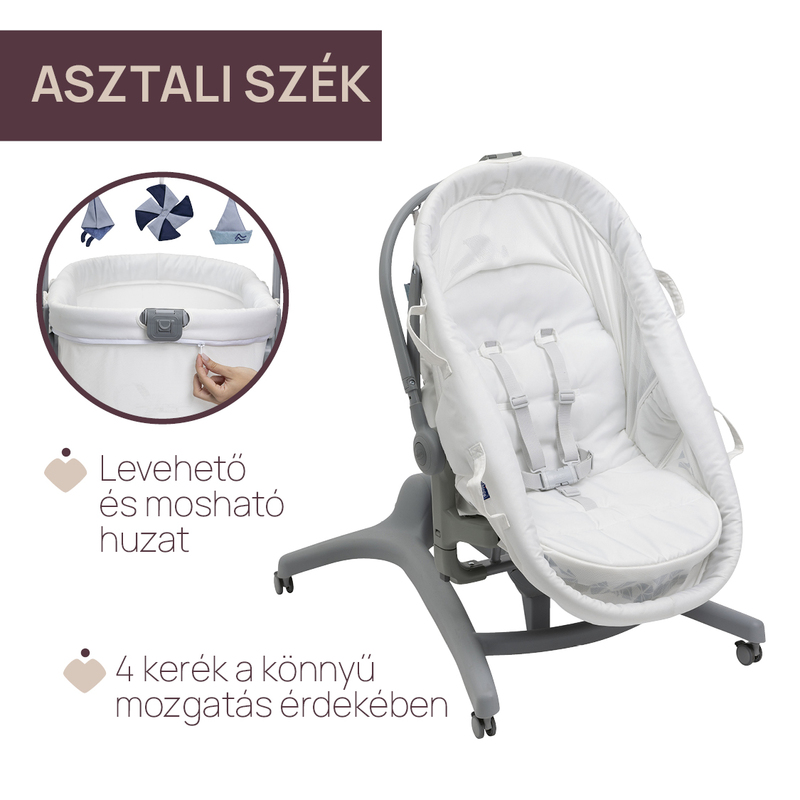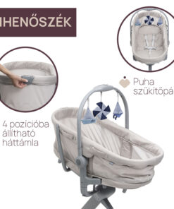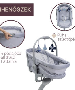 Babaágy a magas vázkereten / Babaágy a vázkeretről levéve / Dönthető pihenőszék / Etetőszék / Gyerekasztalhoz szék.