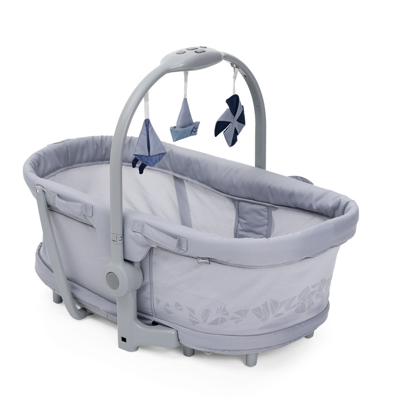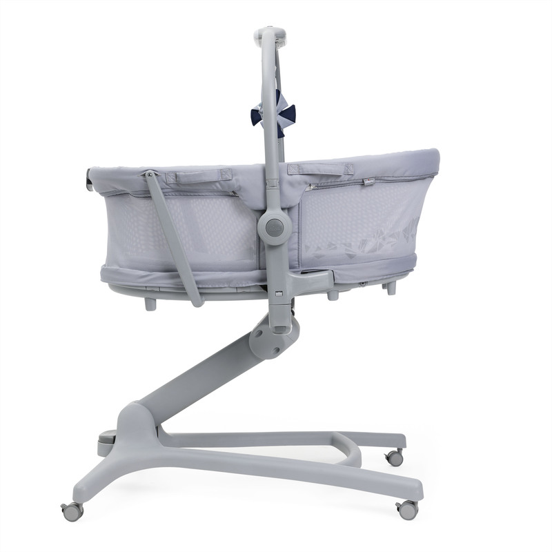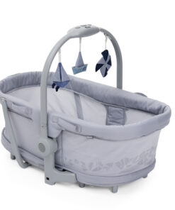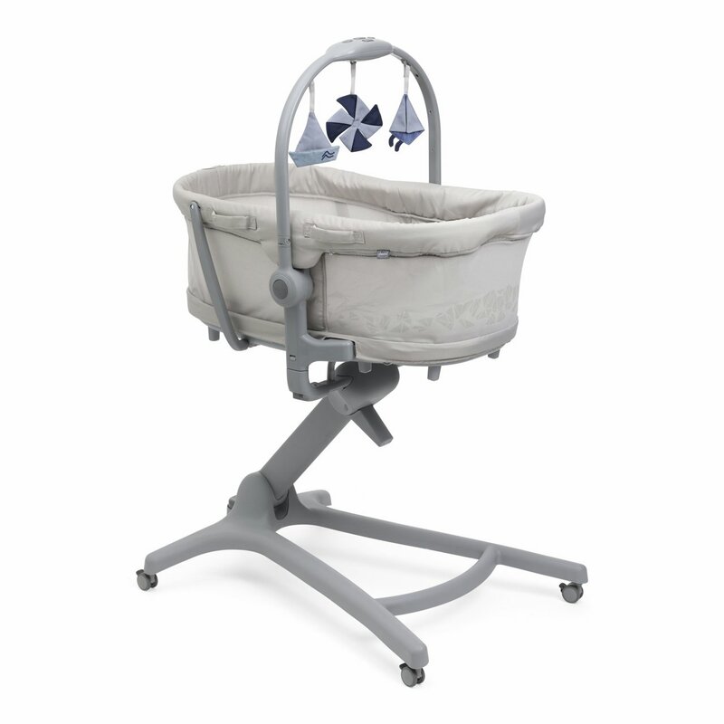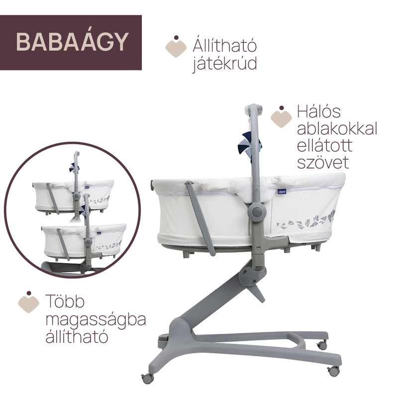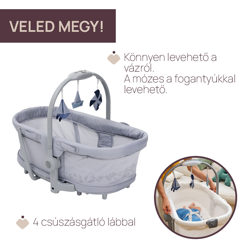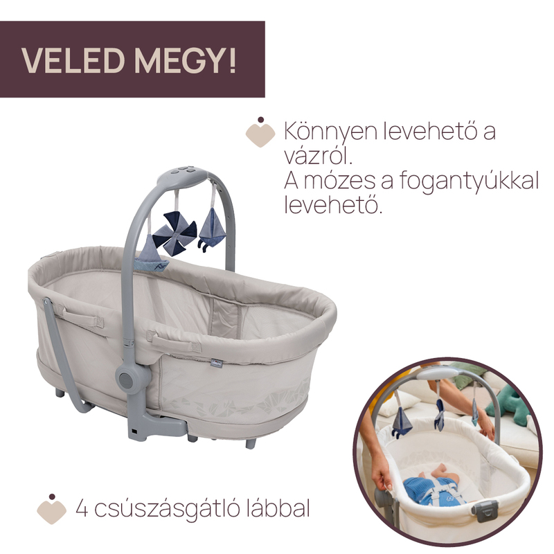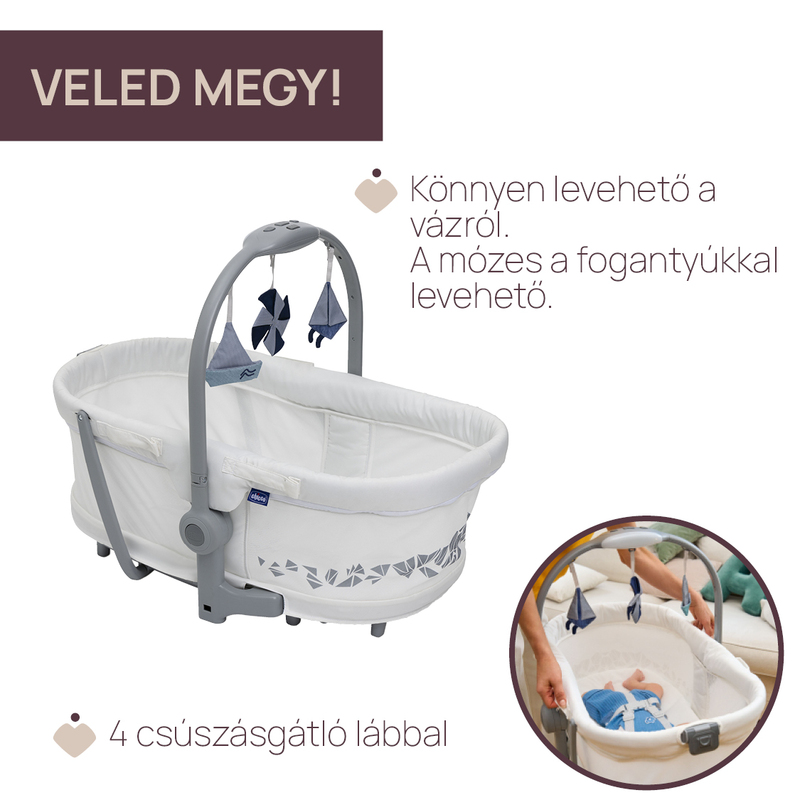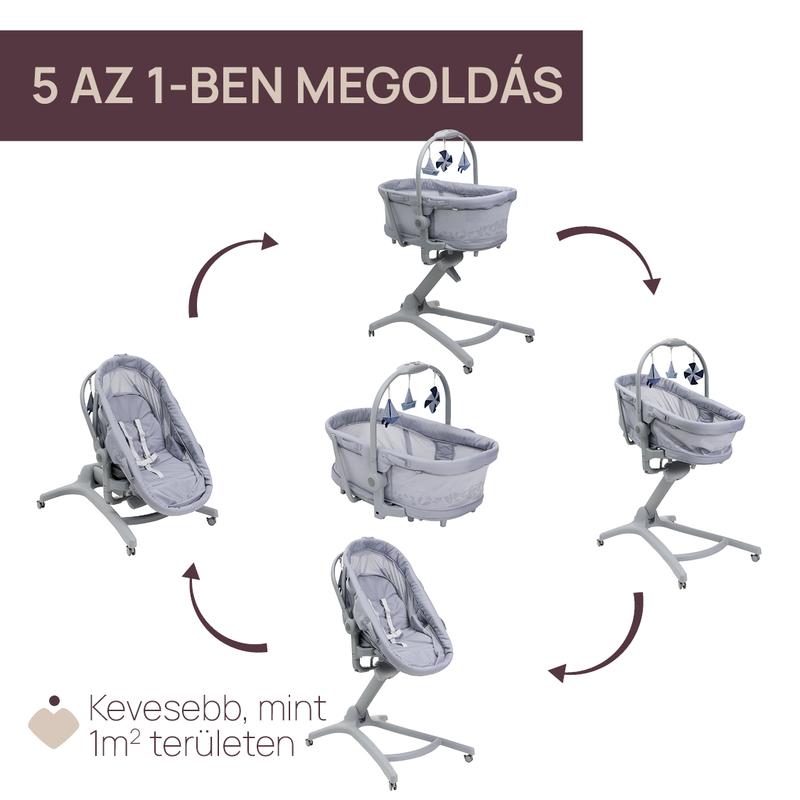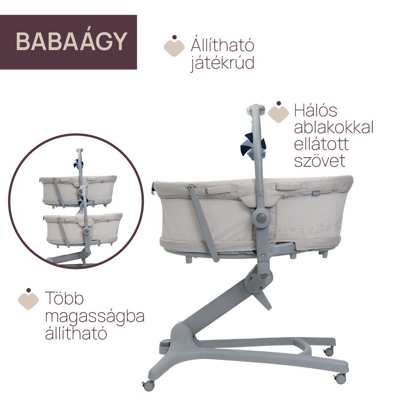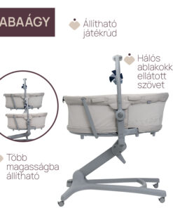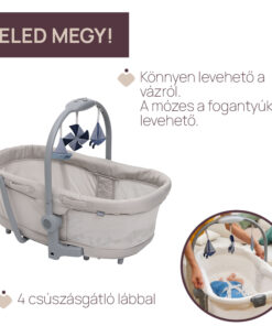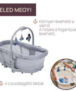 Babaágy (0-6 hónap): A magas vázon vagy a vázról levéve a babaágyat, és teljesen vízszintesre döntve a háttámlát és mózessé alakítva az ülést, annak fészek formája kellemes környezetet biztosít az újszülött babának az első szunyókálások idejére. A puha, kivehető matrac méretei: 75 x 38 x 3 cm. A hálós ablakokkal ellátott szövet megkönnyíti a levegő átjutását a kiságy belsejében, és lehetővé teszi, hogy a szülő mindig lássa a babát.