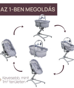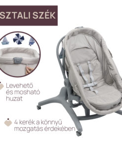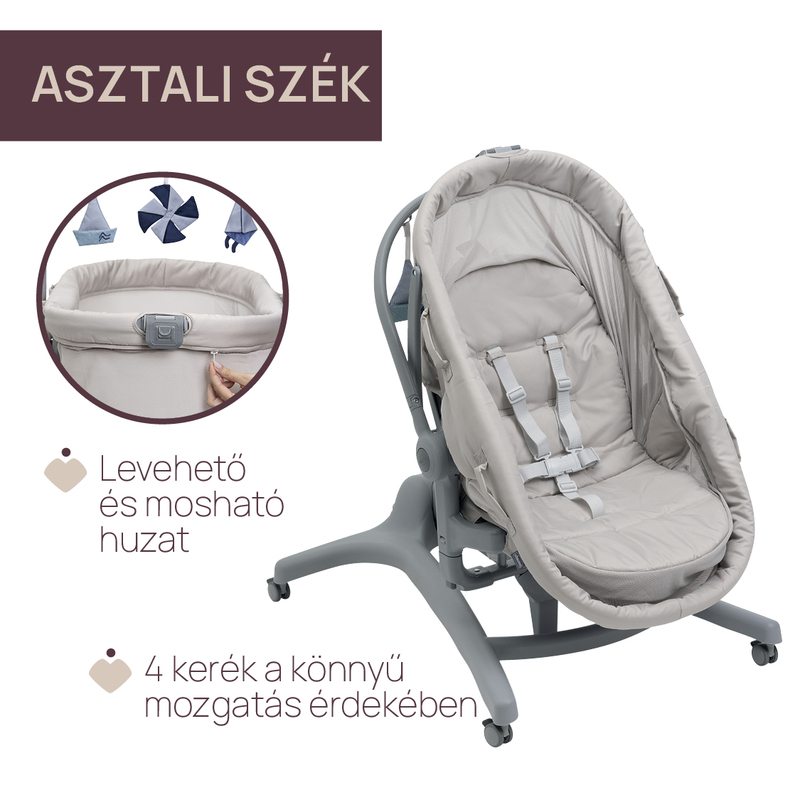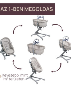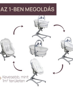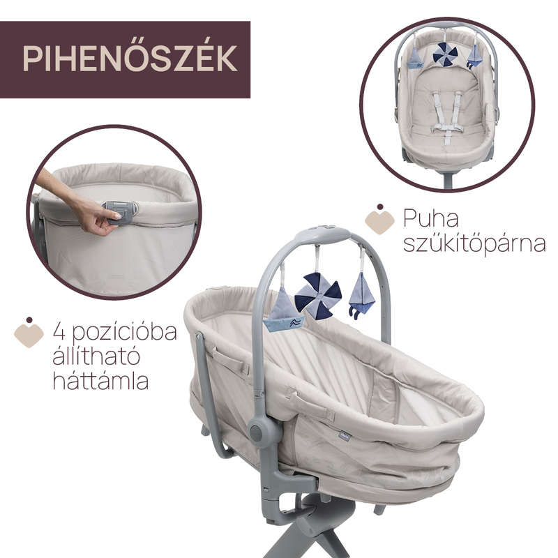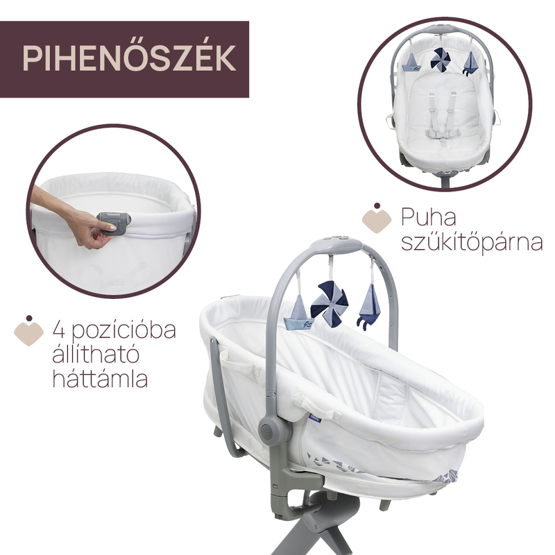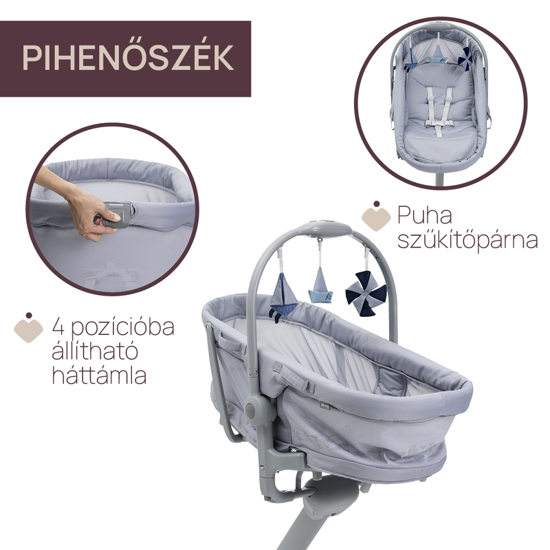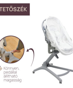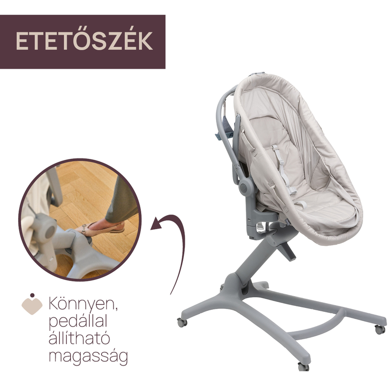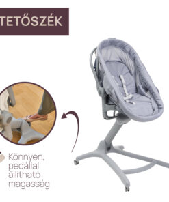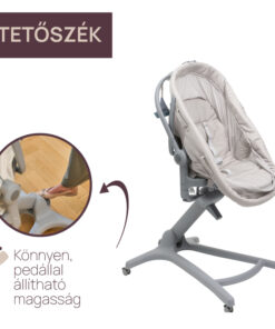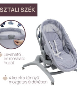 Pihenőszék (0-6 hónap): A különböző pozíciókban dönthető háttámla és a puha szűkítőpárna biztosítja a kényelmet a növekedő kisbabának. Ha más szobában van dolgunk, a kerékfékeket feloldva áttolhatjuk a széket, a kisbabánk pedig mindenhol jól láthat minket a magasított pihenőszékből.