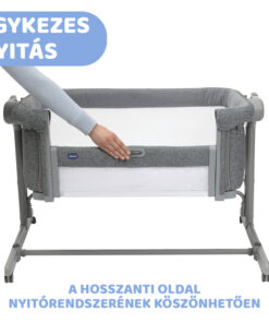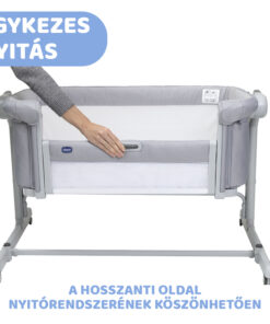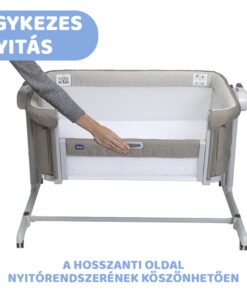 A Chicco Next2Me Magic Evo gyors és egyszerű nyitási rendszerrel van felszerelve. A csúsztató mechanizmus egyetlen gombnyomással nyílik és záródik, még akkor is, ha a kiságy az ágyhoz van rögzítve. Rendkívül kényelmesen használható.