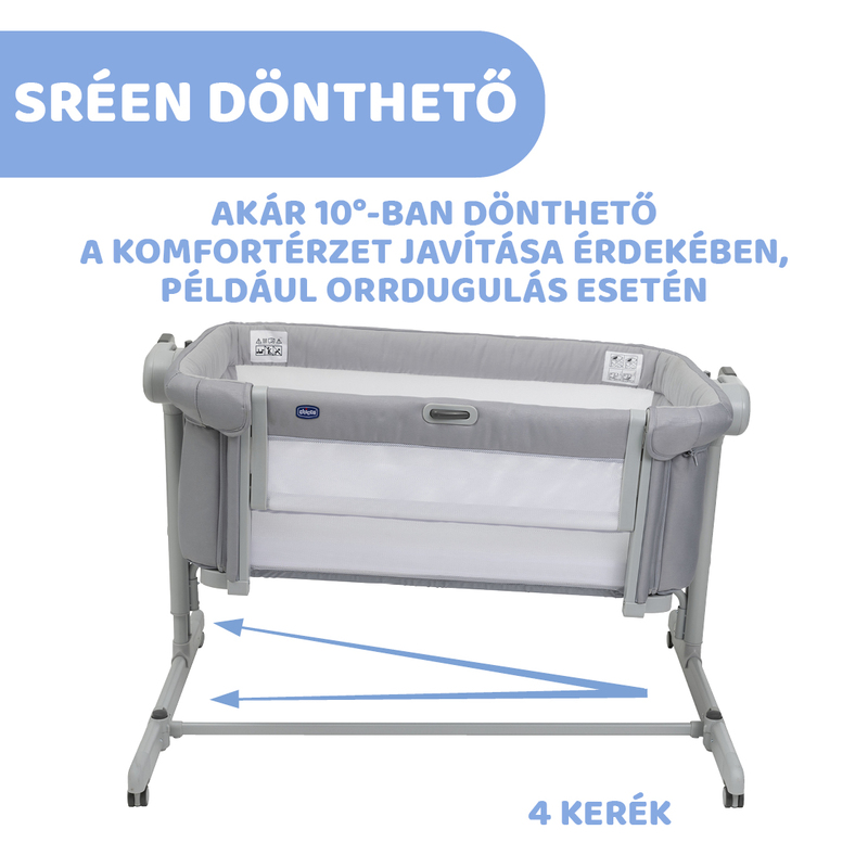 A Chicco Next2Me Magic Evo 11 magassági fokozattal van felszerelve, hogy alkalmazkodjon a különböző típusú ágyakhoz. A lábak behajthatók, így akár fiókos ágyak mellett is elfér ez a kiságy.