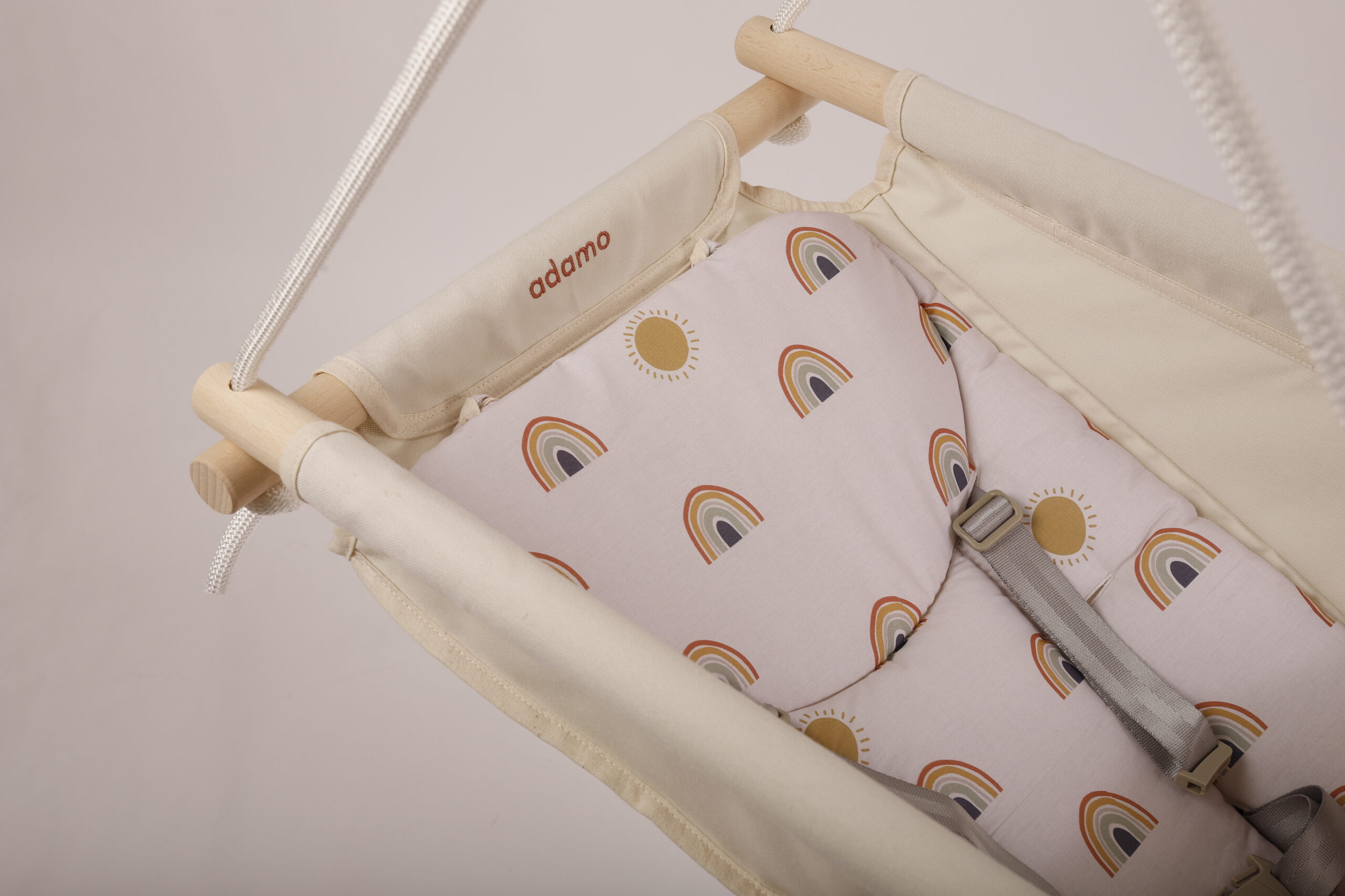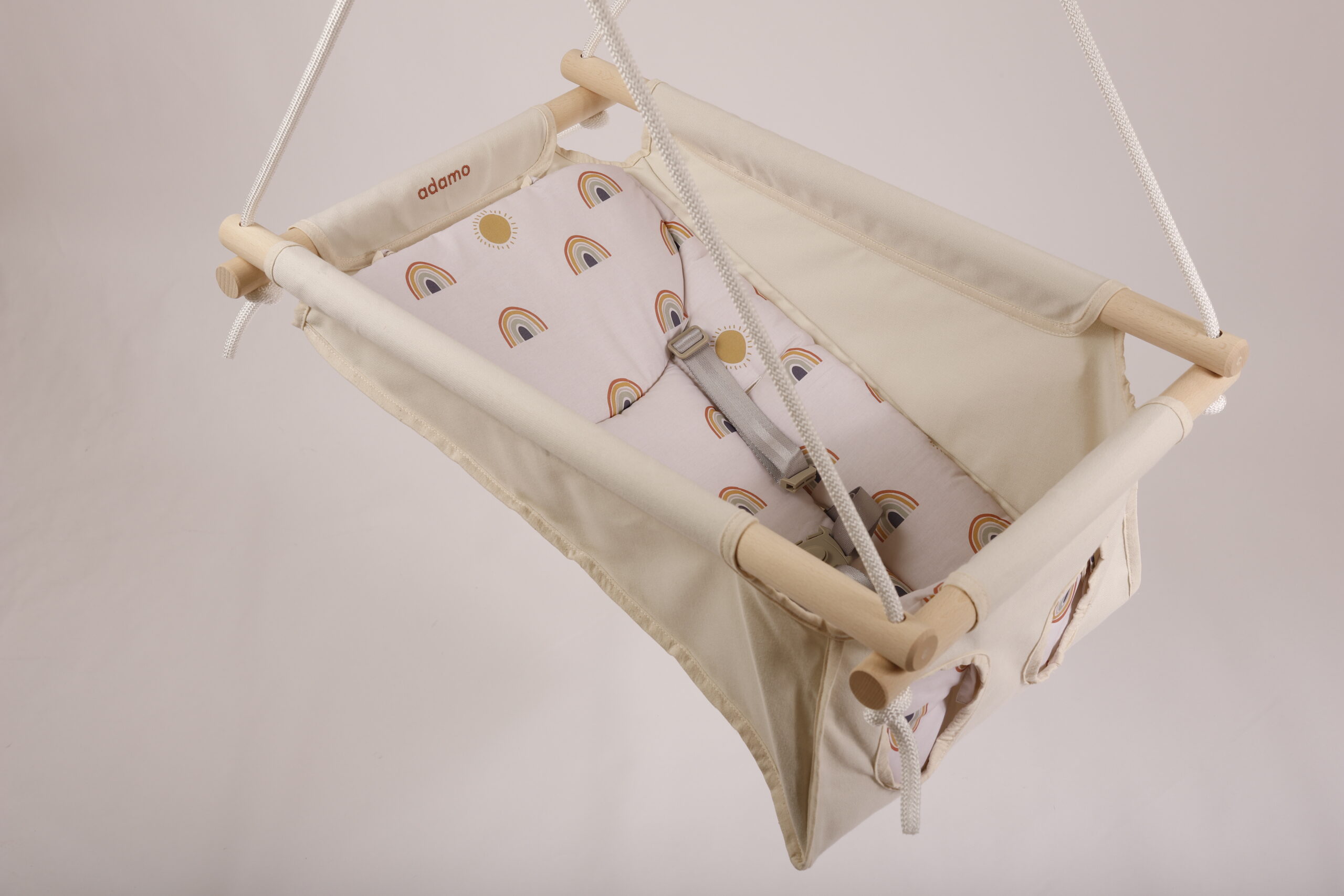 Az Adamo hinta, a rég elfeledett bölcső és az egy ponton függesztett hinta ötvözete. Újszülött kortól, egészen a baba 3 éves koráig tudjátok használni! Egy ponton, egy rugóval ellátott kötélzeten függeszkedik, így minden irányú mozgást tud produkálni. Használható bölcsőhintaként, ülőhintaként, rugós hintaként. Egyszerűen megunhatatlan!