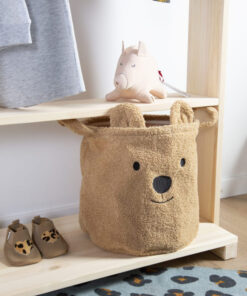Ez a tündéri Teddy tárolókosár alkalmas játékok, ruhák és egyéb dolgok tárolására. A kosárkát ideális mérete miatt akár egy kis szekrényre is elhelyezheted, így egyszerre praktikus és trendi elem a gyerekszobába. A puha szövet és a tüneményes mackó fülek azonnal vidám hangulatot varázsolnak a szobába. A kosár praktikus belső béléssel rendelkezik, amely nedves ruhával is könnyen tisztítható. Figyelem! A kosárka nem játék, csak dekorációként vagy tárolókosárként használd!