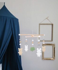 Aranyos, fából készült kiságyforgó, amelyen imádnivaló mackók és nyuszik láthatók.