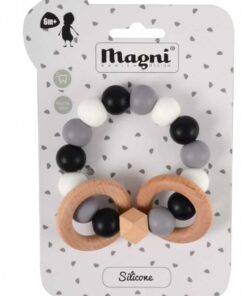 Ez a gyönyörű szilikonból és kezeletlen fából készült rágóka tökéletes játék a baba kis kezeinek. A puha fa és a színes szilikon gyöngyök serkentik a csecsemő látását és mozgását és megnyugtató érzést keltenek a fogzás