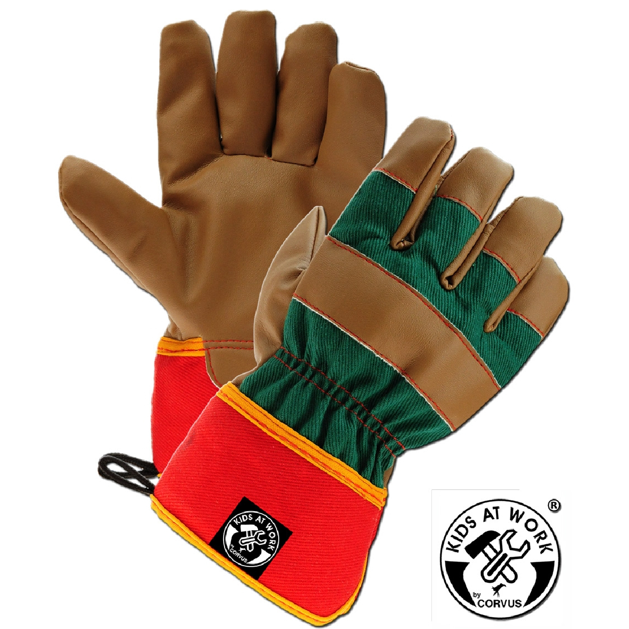Gyermekkézre méretezett, erős vászonból és műbőrből készült munkakesztyű.