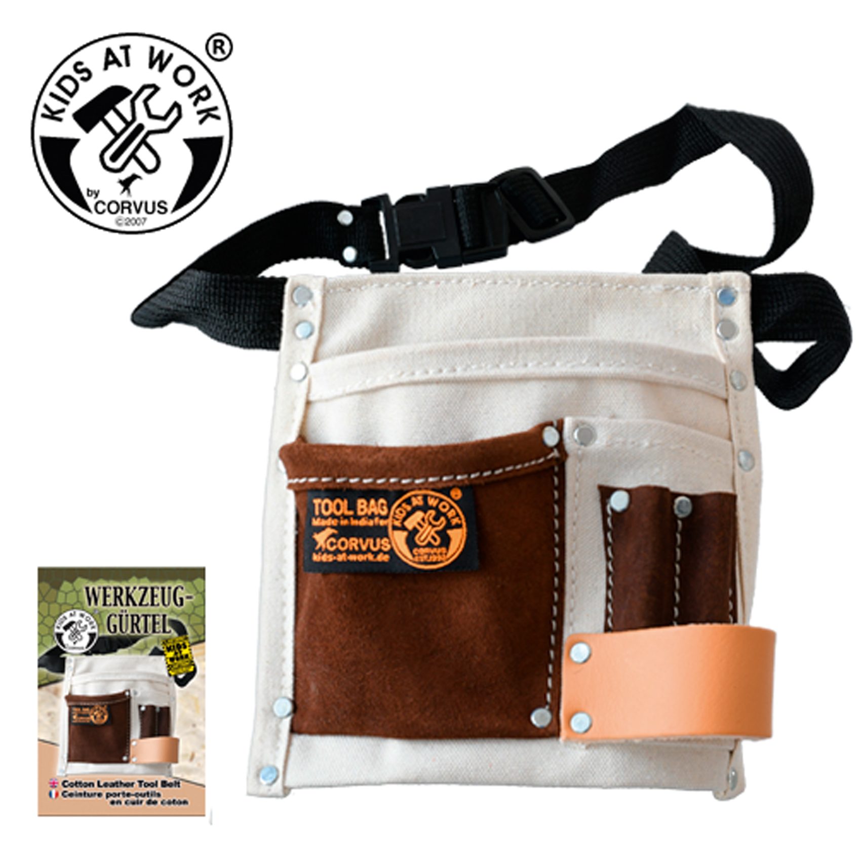 Erős zsákszövetből és bőrből készült egyoldalas övtáska a gyerekméretű szerszámokhoz.
