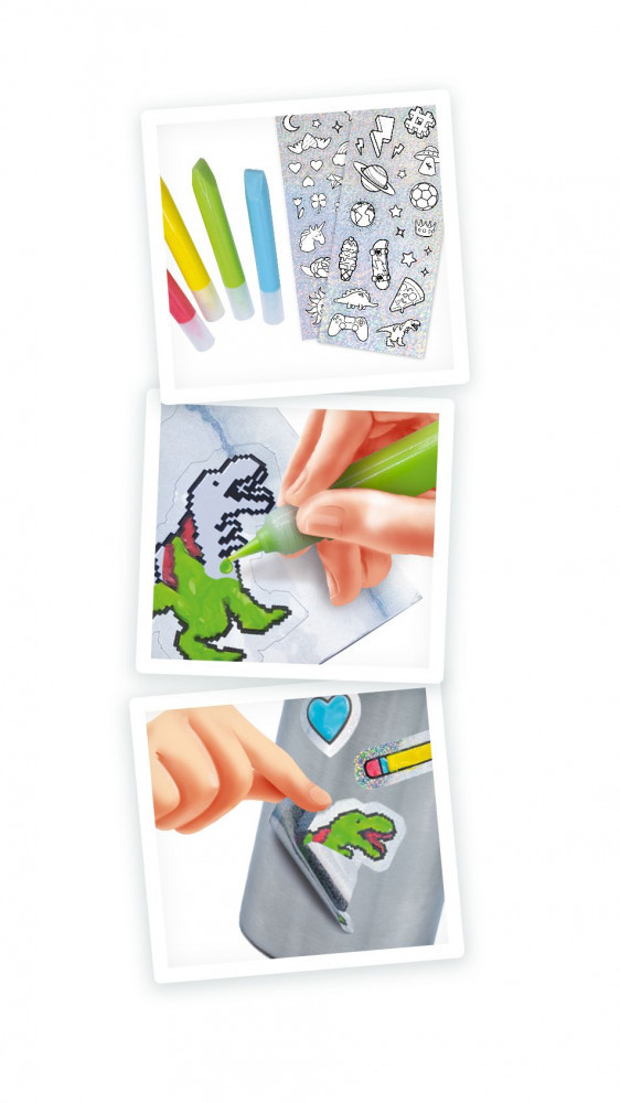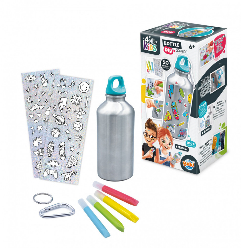 Válaszd ki kedvenc motívumaidat, színezd ki őket a négy tubus 3D festék segítségével és a kész matricákat ragaszd fel a palackodra!