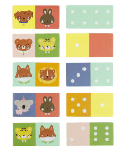 A dominójáték mindkét oldalával játszható: az egyik oldalon kedves állatos képek, a másik oldalon számok vannak. Vastag kartonból készült, ideális a kis kezekbe. Kihúzható dobozban az egyszerű tárolásért. Fejleszti a koncentrációs képességet, játszva vezet be a számok világába.