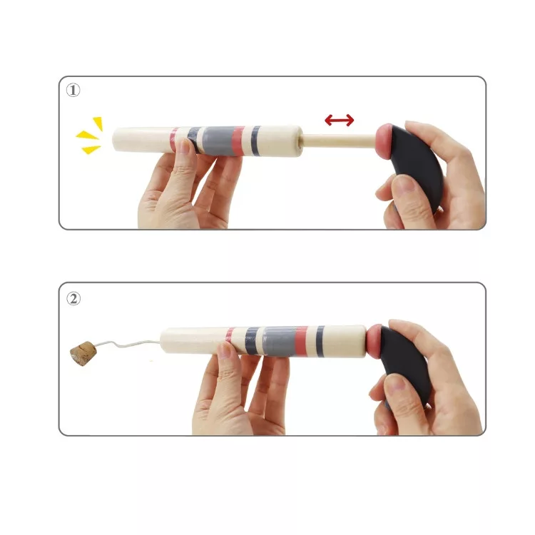 Ez a hagyományos fa dugós pisztoly garantáltan visszarepít a régi idők játékélményeibe. A kiváló minőségű fából készült fegyver könnyű és tartós, így ideális választás gyerekek számára. A pisztoly végén találhatódugó egy zsinórral van rögzítve, így nem veszik el lövés közben. Egy jól irányzott húzással a dugó nagyot pukkan, ami izgalmas játéklehetőséget biztosít a családi délutánokon vagy barátokkal töltött idő során.