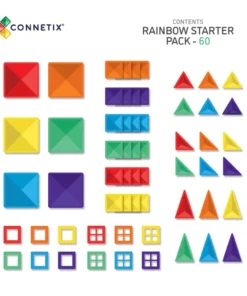 A Connetix Rainbow Starter Pack 60 darabos készlete ideális első lépés a mágneses építőjátékok világába. A szett különféle színű és formájú elemeket tartalmaz – háromszögeket és négyzeteket –, amelyekkel a gyerekek könnyedén hozhatnak létre saját, egyedi konstrukciókat.