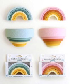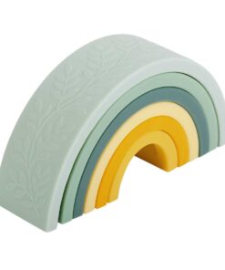 Szilikon szivárványos egymásra rakható játék, gyönyörű levéldizájnnal a külső gyűrűn. Használható beltéri és kültéri játékhoz, vagy fürdőjátékként, minden korosztály számára, beleértve a babákat is. A minimalista kialakítás megkönnyíti a nyílt végű játékot; egymásra rakhatod, kirakhatod, építkezhetsz, egyensúlyozhatsz és még rághatod is a darabokat! A szilikonból készült játék rendkívül tartós és könnyen tisztítható.