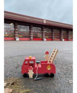 Fából készült színes tűzoltóautó a legkisebb gyerekek számára. Ezzel a menő tűzoltóautóval gyorsan ott lehetsz, ahol tűz ütött ki. A 2 kis maci tűzoltó a tömlővel felmászik a lépcsőn, és gondoskodik a tűz eloltásáról. A létra különböző irányokba fordítható és le is hajtható. A tűzoltó tömlőt felcsavarhatod, ha végeztél a játékkal.