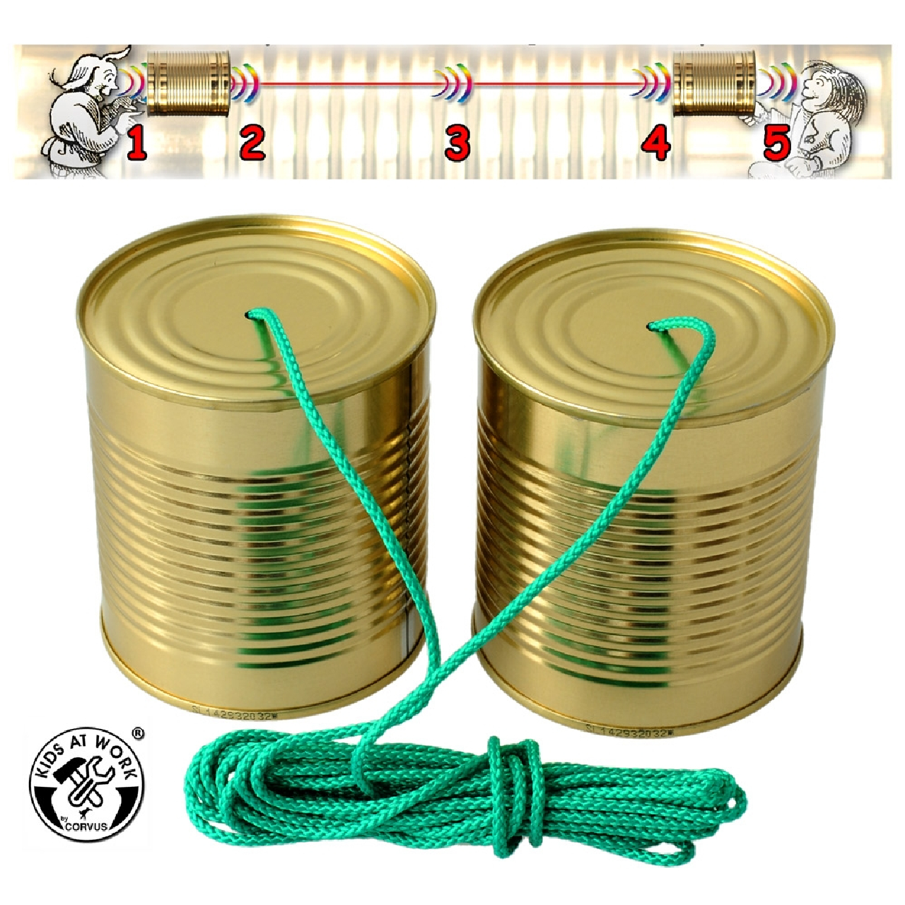 Egy néhány méteres kötelet be kell fűzni a dobozokba, és úgy rögzíteni egy-egy csomóval, hogy a konzervdobozok alja legyen összeköttetésben. Ha feszesen tartjátok a zsinórt, és az nem ér hozzá semmihez, tehát csak a levegőben van, akkor tudtok egymással beszélni. Az egyik belebeszél a konzervdobozba a másik addig a füléhez tartja. Még a suttogást is hallani fogjátok.
