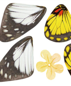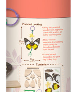 A mellékelt fa eszközzel vidd fel a színes matricákat a megfelelő elemekre, majd szereld össze a pillangó charm-ot a készletben található fonalak és kapcsok segítségével.
