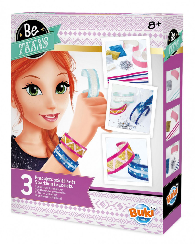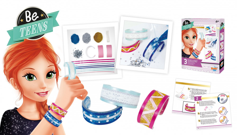 A készlet tartalma: 3 db karkötő alap, 3 féle csillámpor, színes szalagok,