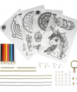 Színezd ki a készletben található színes ceruzákkal a hőre zsugorodó műanyag medálokat és készíts belőlük egyedi ékszereket!