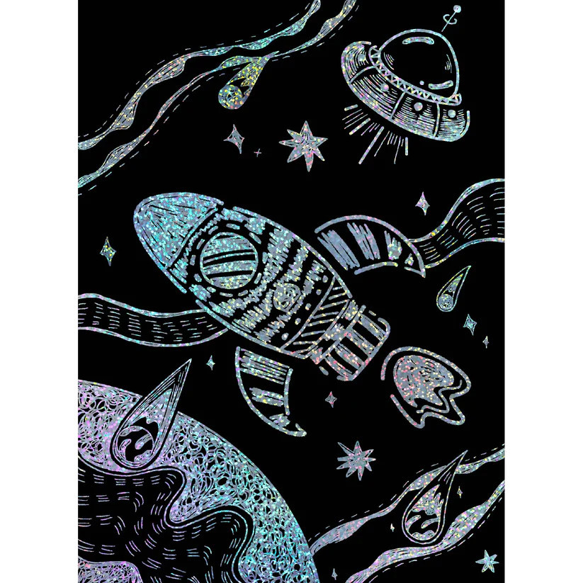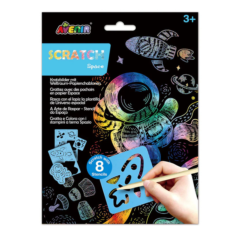 Készíts karcképeket stencilek segítségével! A játékkészletben 8 db stencil, 2 karckép alap (egy csillogós és egy szivárvány színű) valamint 1 karceszköz található.