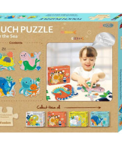 A dobozban 4 tengeri állatos kép található, melyek mindegyike 4 darabból rakható össze. A könnyű, fából készült elemek texturált felületeket tartalmaznak, hogy a kicsik tapintását is fejlessze, miközben a kirakóval játszanak.