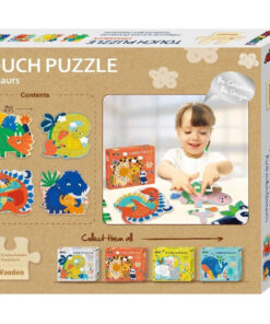 A dobozban 4 dinoszauruszos kép található, melyek mindegyike 4 darabból rakható össze. A könnyű, fából készült elemek texturált felületeket tartalmaznak, hogy a kicsik tapintását is fejlessze, miközben a kirakóval játszanak.