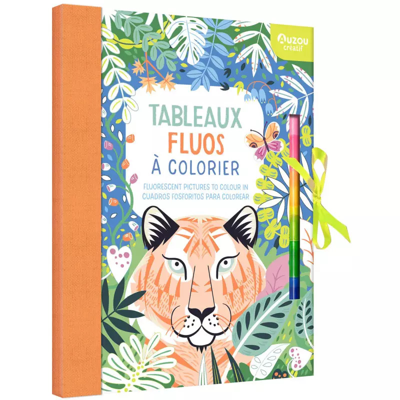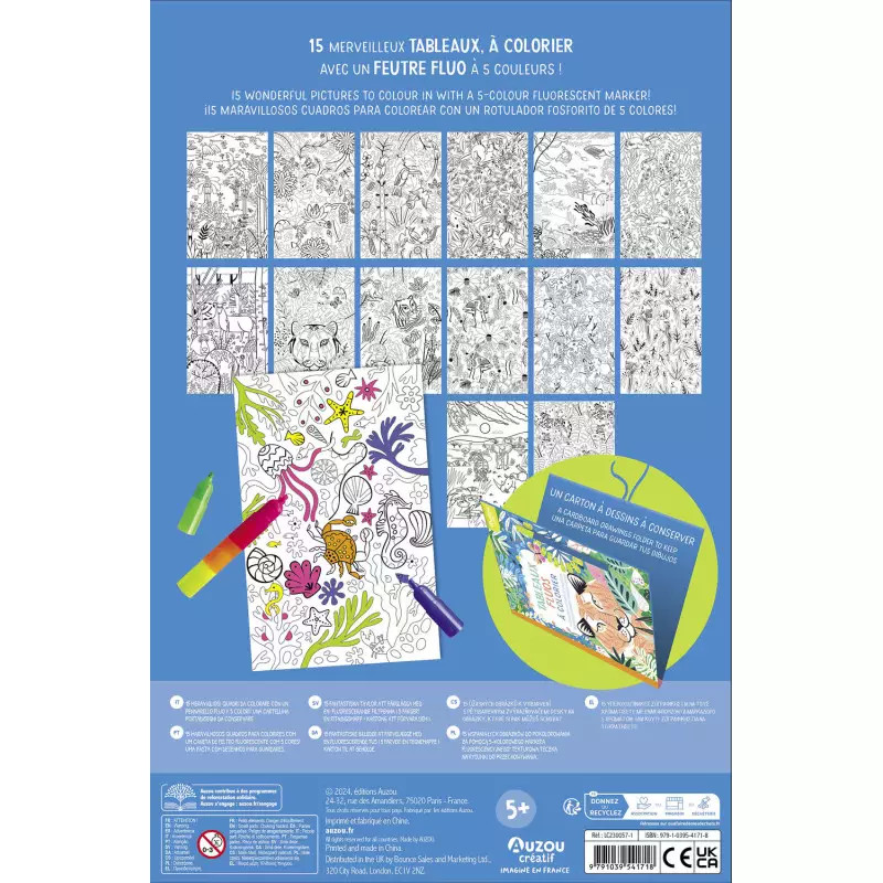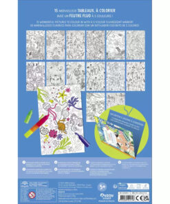 15 lapos nagyméretű színező könyv kemény borítással és 5 színű egymásba pattintható neon filctollal.