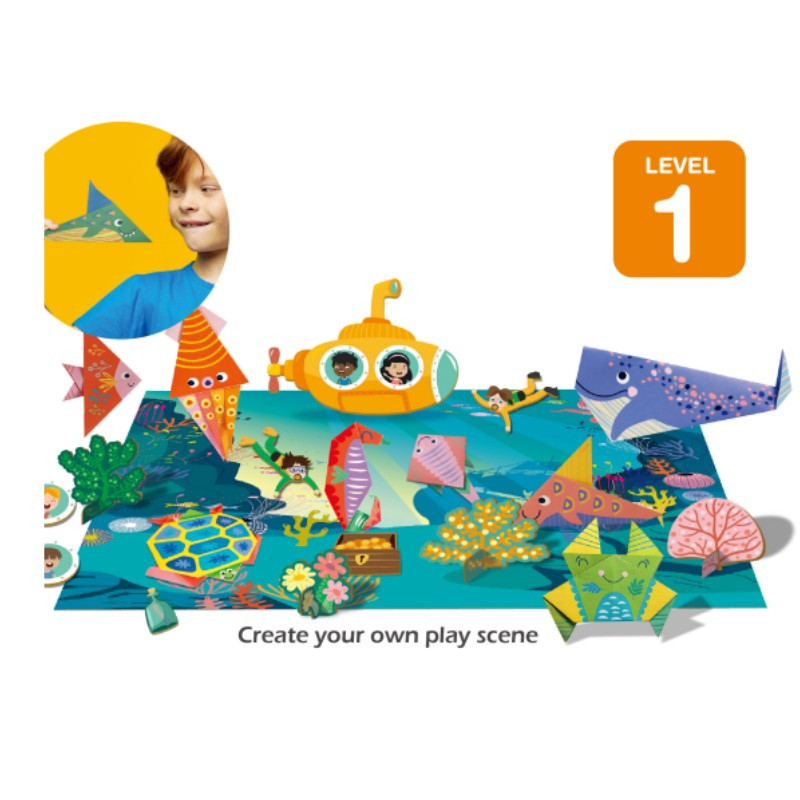 Hajtogasd meg kedvenc állataidat és merülj el az origami világában! A készlet tartalmaz 40 db kétoldalas hajtogatható lapot, 2 összeilleszthető 3D kartonfigurát és 1 nagyméretű posztert, amely az asztalon kiterítve játéktérként funkcionál. A dobozban egy részletes útmutató füzet is található, mely segít a különböző hajtási technikák elsajátításában.