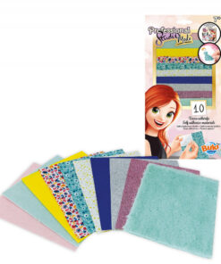 Öntapadós anyagok a Buki Professzionális divattervező készletének újratöltéséhez! Tartalma 10 féle öntapadós anyag: szőrme, csillogó textil, műbőr, nyomott mintás pamut, filc.