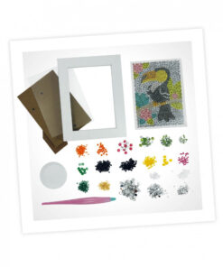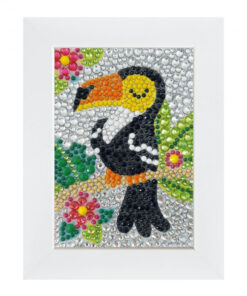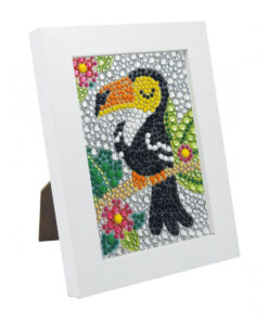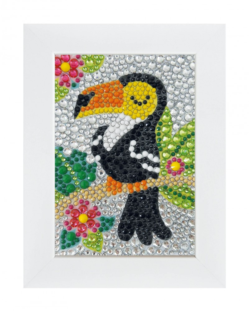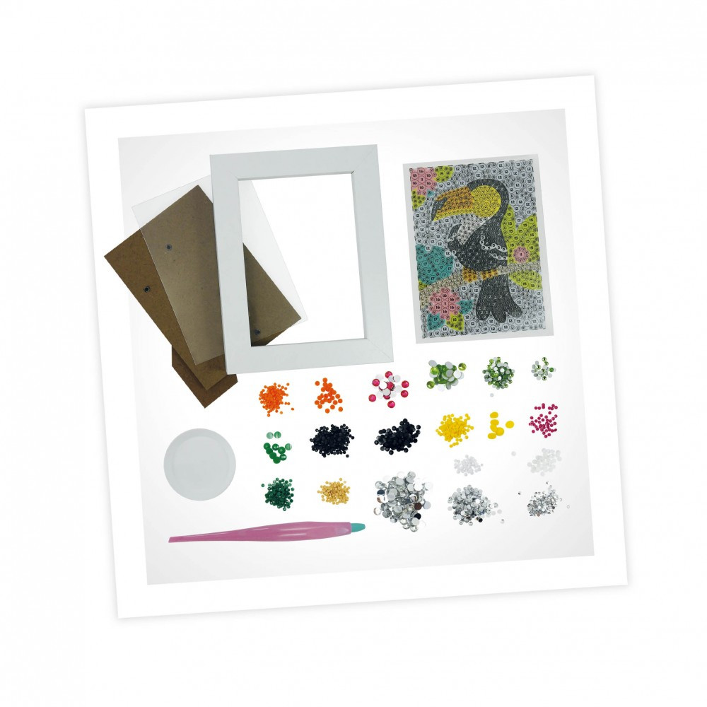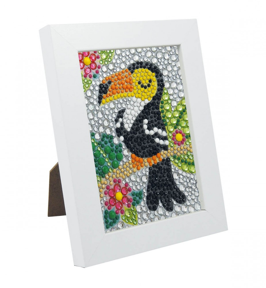Készíts csodálatos csillámos tukán madarat! Tapaszd a gyöngyöket a képeken a megfelelő helyre, majd a képet helyezd a fa képtartóba. Az elkészült mű a szobád tökéletes dísze lehet, de ajándéknak is tökéletes.