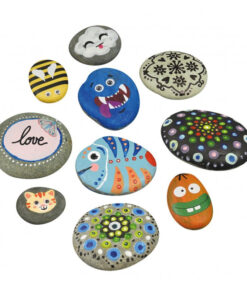 A készlet tartalma: 6 db 5-7 cm-es kavics, 4 db 3-5 cm-es kavics, 1 fa lap, ecset, festékek, matricák, filctollak, felragasztható mozgó szemek, színesen illusztrált használati útmutató.