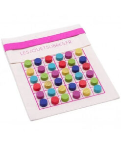 A tárolózsák 21 x 17 cm, így bőven van hely a kényelmes játékhoz a 36 db színes fa koronggal.