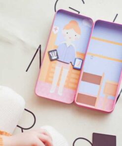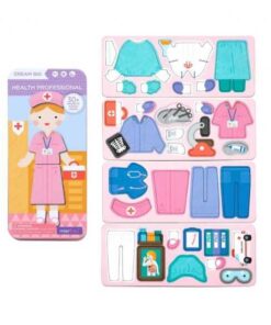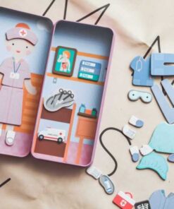 Ez a mágneses kórház készlet több mint 30 mágneses puzzle-darabot tartalmaz, melyekkel a gyerekek beöltöztethetik a karakterüket, és kitalálhatják saját történeteiket. A mágneses doboz segítségével a gyerekek mindkét kezükkel játszhatnak, így serkentve a bal és a jobb agyfélteke fejlődését.