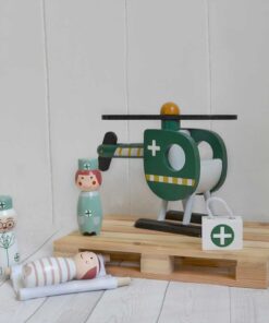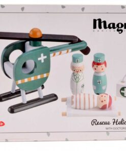 Gyönyörű fából készült helikopter játékfigurákkal és kiegészítőkkel a Magni márkától!