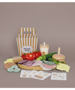 Ezzel a szuper hamburger menü játékkészlettel garantált a szórakozás! A fantáziadús megoldásnak köszönhetően több ízletes ételt is felszolgálhatsz, amelyeket a mellékelt menükártyák szerint készíthetsz el. A hamburger úgy működik, mint egy toronyépítő játék, a közepén lévő pálcára lehet felhúzni a középen kilukasztott hamburger töltelék elemeket. A dobozban található négy menükártya a hamburger, a sült krumpli és a hozzá tartozó ital különböző kombinációit sorakoztatja fel, ám ennek a játéknak csak a gyermeki fantázia szabhat határt.