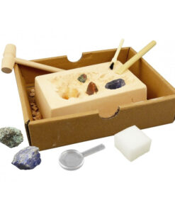 A dobozban található szerszámok segítségével fedezdf fel a gipsztömb belsejében található 7 féle izgalmas ásványt és követ, köztük a fehér kvarcot, az obszidiánt, a türkizt és az achátot.