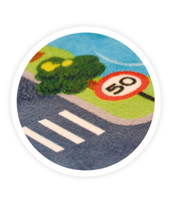 A gyerekek városi környezetben vezethetik kisautóikat, miközben megismerkedhetnek a közlekedési lámpákkal, stoptáblával, parkolóhelyekkel és gyalogátkelőhelyekkel. A szőnyeghez 3 db kisautó is tartozik (véletlenszerű modellek).