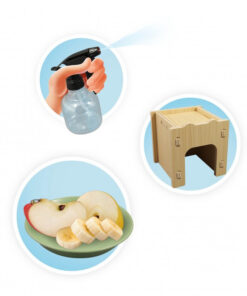 Tartalma: 1 megfigyelő terrárium, 1 vízpermetező, 1 fa kiskunyhó, 1 tál, 1 fából készült pálya, matricák és színes illusztrált útmutató.