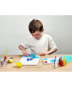 A készlet tartalma: egy fa keret, 8 kerek filctoll, 5 nyomda, 5 festékes flakon, 1 paletta, 2 habhenger, 2 habszivacs nyomda, 2 ecset, 5 sablon, 5 matrica lap, 10 db A4-es lap.