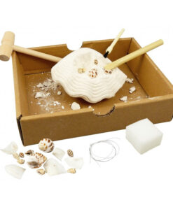 A csomag tartalma: 1 gipsztömb a belsejében található kisebb-nagyobb kagylókkal, kagylódarabokkal, 1 kalapács, 1 véső, 1 ecset, 1 szivacs, 1 fonal, 1 papírtálca.