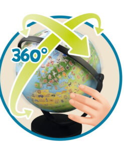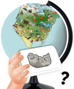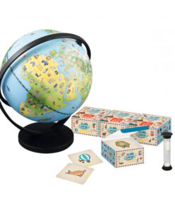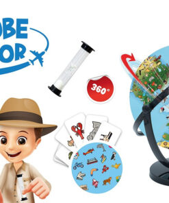 Minden irányba elforgatható, illusztrált 20 cm-es földgömb, amely megismerteti a gyerekekkel a világot. A térképen több mint 300 rajz található: állatok, műemlékek, sportok, ételek stb. A cél? Találd meg a földgömbön lévő rajzot a lehető leggyorsabban. A gyermek húz egyet a 300 kártya közül, megnézi a rajzot, megfordítja a homokórát, és megkeresi a földgömbön a rajzot, mielőtt a homokóra lejárna. Minden kártya hátoldalán egy anekdota vagy információ található angolul.