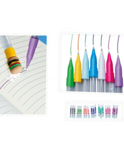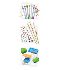 Tartalma: 7 elkészíthető toll, 21 radírozható tintatöltő (7 különböző színű), 2 filctoll, 3 ceruza, 1 jegyzetfüzet, 4 tekercs ragasztószalag, 1 ív matrica, 5 színű radírgyurma, 3 forma radírok készítéséhez, 7 figura, 1 doboz flitter, 1 doboz színes dekoráció, 2 nagy pompon, válogatott minigyöngyök, kis pomponok, egyéb gyöngyök stb.