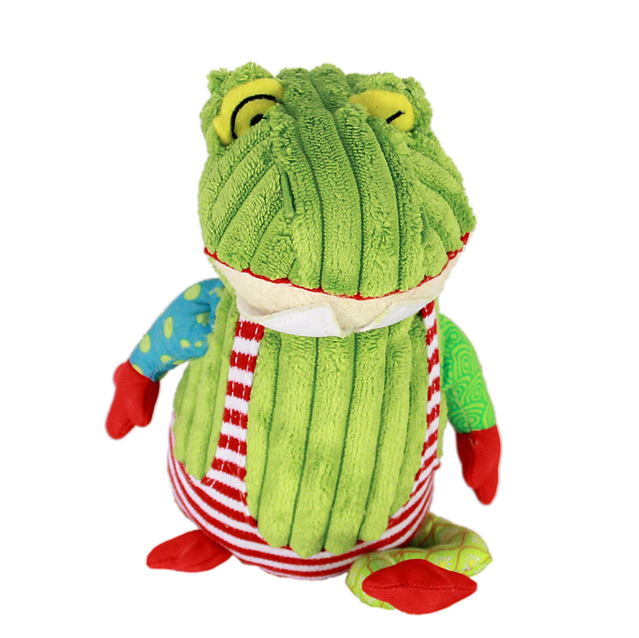Zenélő, békát formázó, plüss játékfigura.