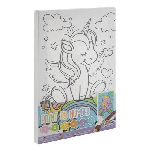 A készlet tartalmaz egy A4-es számozott vászonképet, 6 féle visszazárható színes festéket, valamint egy ecsetet.